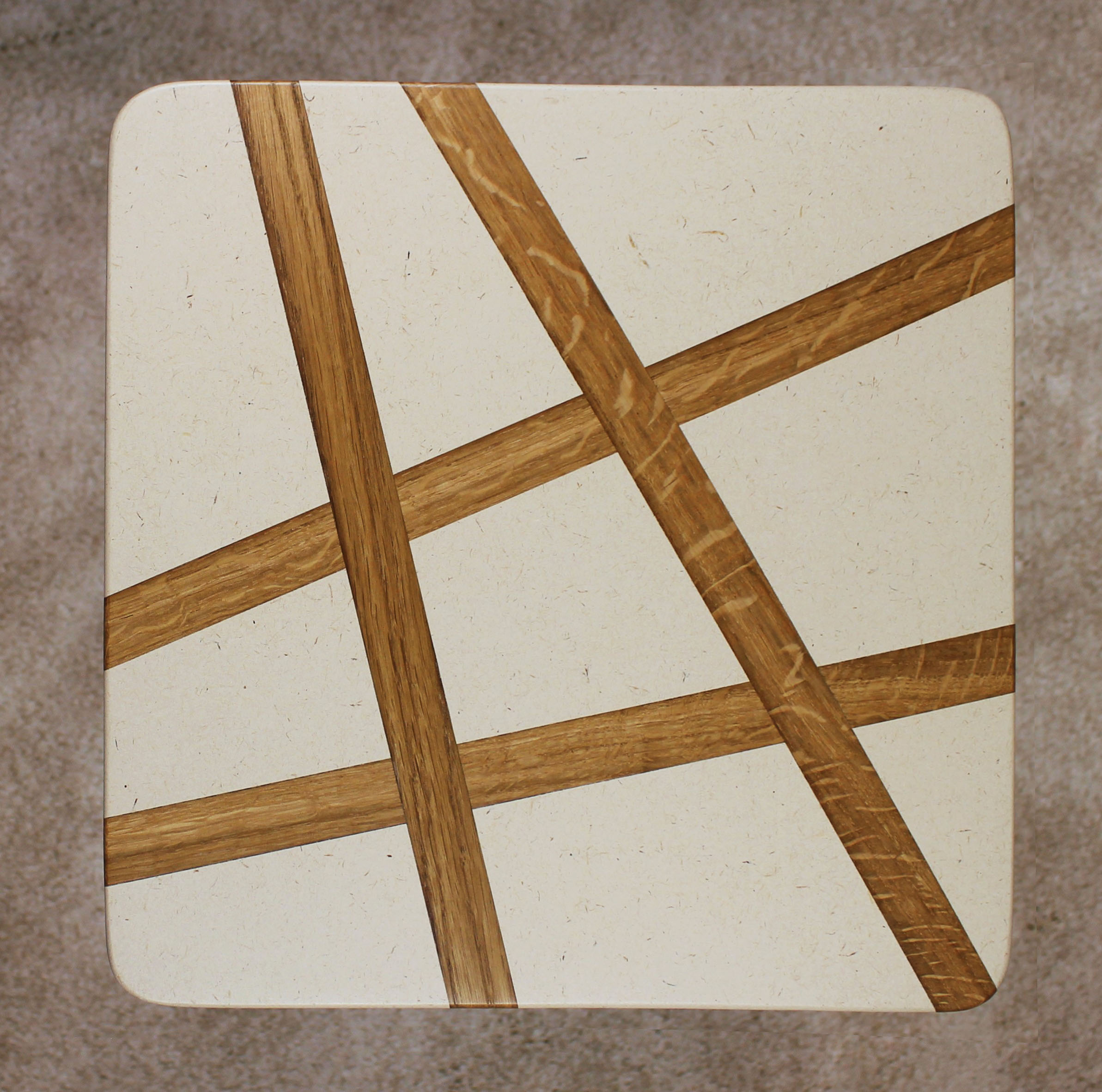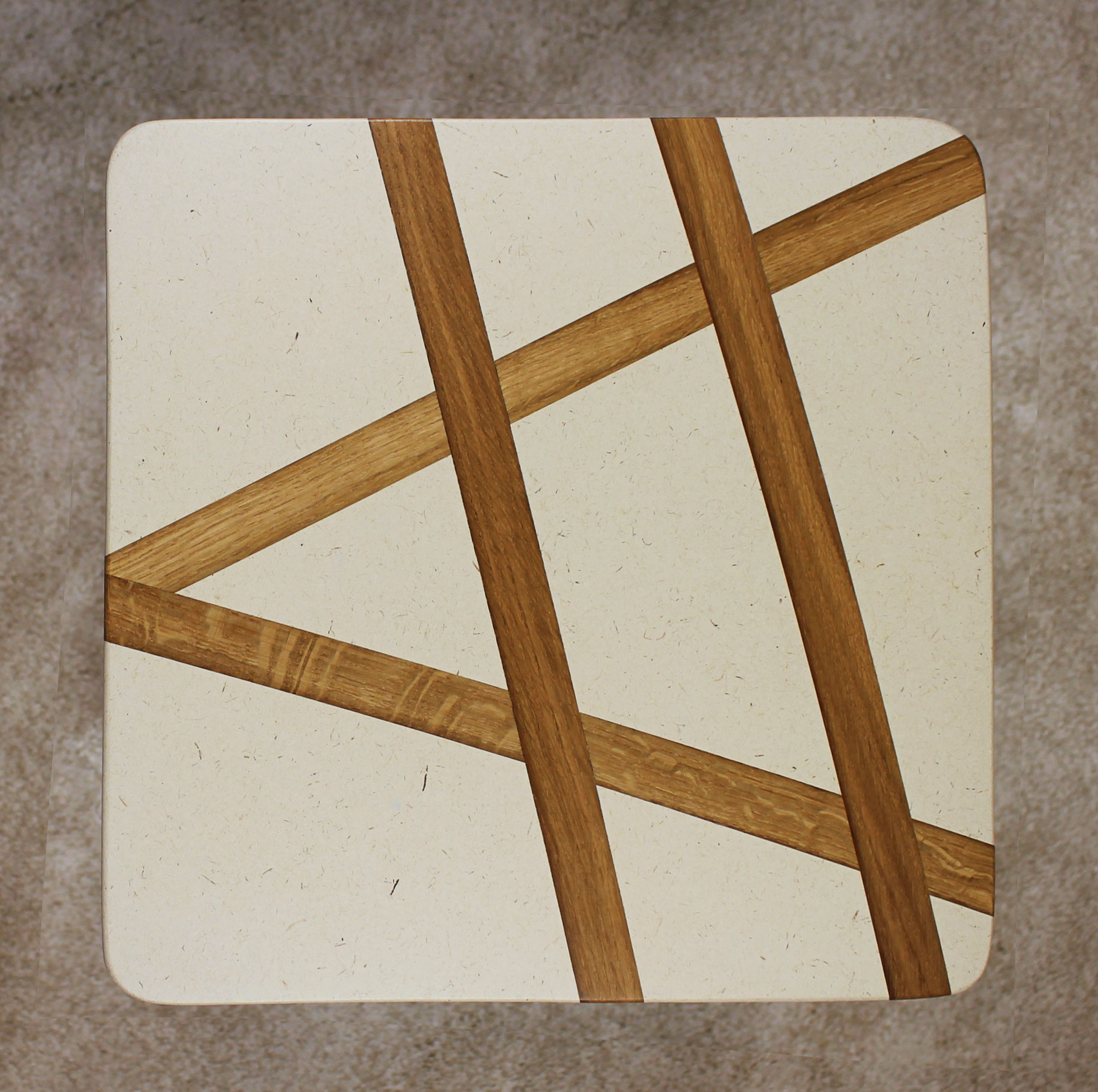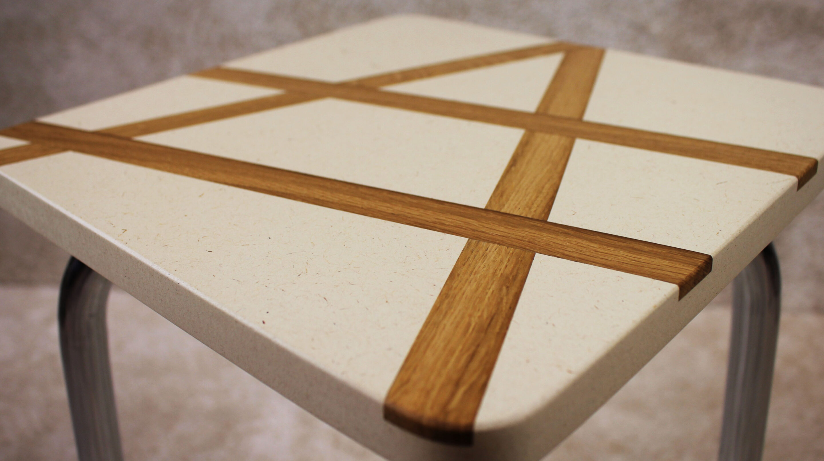 Quoi de mieux pour tester cette nouvelle colorie (WhitePearl) de Valchromat qu’un joli tabouret avec des incrustations de chêne massif ?